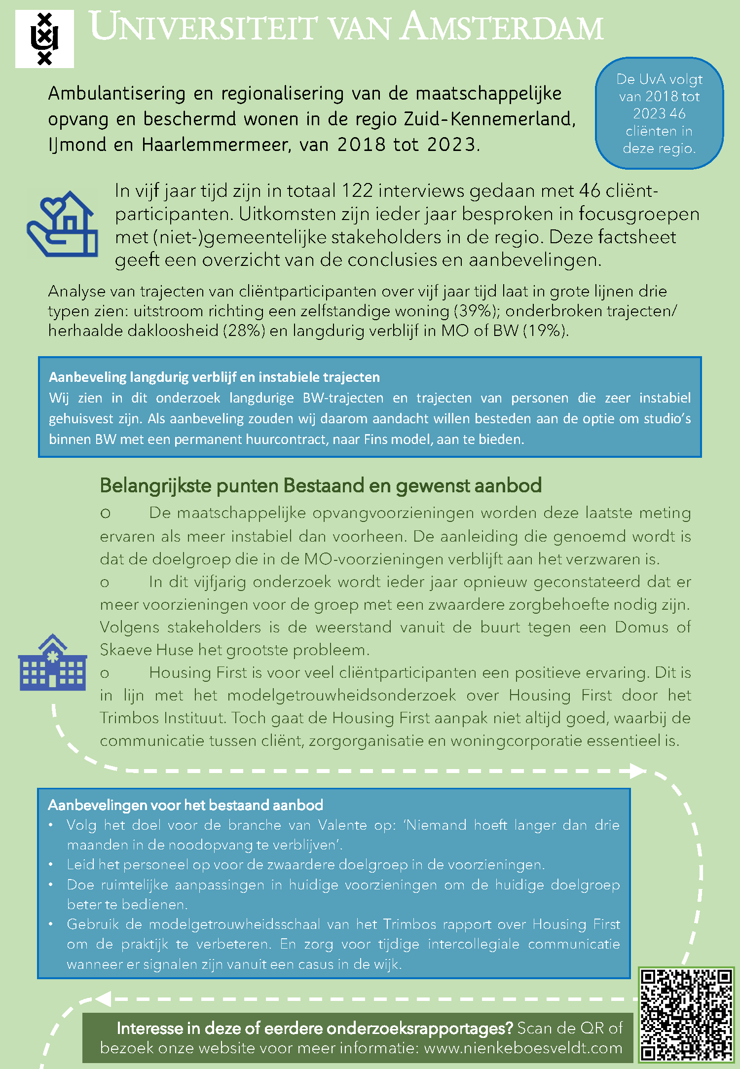 Het onderzoek in de regio Regio Zuid-Kennemerland, IJmond en de Haarlemmermeer heeft gelopen van 2018 tot en met 2023. Hiervoor zijn de afgelopen jaren 46 personen gevolgd en hebben in totaal 122 interviews met personen gebruikmakend van diensten vanuit MO of BW plaatsgevonden. Wij legden de bevindingen vanuit dit clientperspectief jaarlijks voor aan de betrokken professionals. Hieronder vind u de laatste en overkoepelende rapportage over de afgelopen vijf jaar, met bijbehorende factsheet.